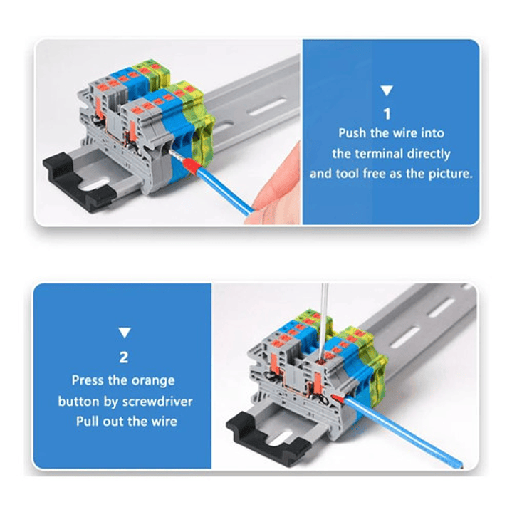 El Borne de conexion electrica sin tornillo para riel DIN , es un elemento especialmente utilizado en gabinetes electricos y cajas de paso, para asegurar la conexión eléctrica entre dos conductores flexibles de cobre (con o sin terminal) o rígido.