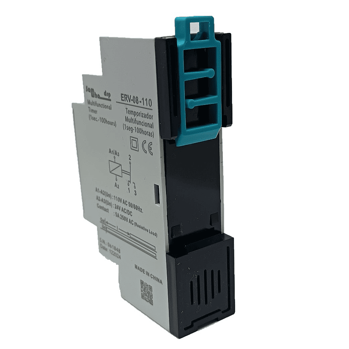 El temporizador ERV-08 es un dispositivo electromecánico diseñado para trabajar como un clásico rele temporizador "On Delay" o de retardo a la conexión.
